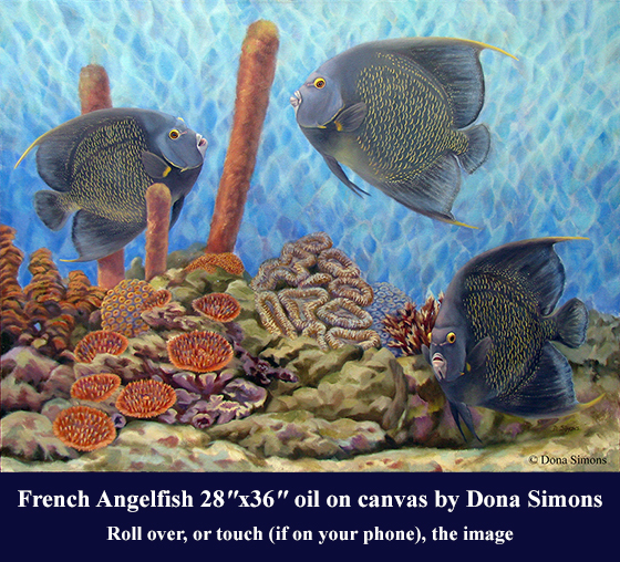 Lawtell here, your very own art guide. On this page is a painting of French Angelfish. First thing I want to know is what, exactly, makes them French? They don’t look French to me. Do they speak French? Are they saying to each other in some secret fish language “Ça va?” “Pas mal, et toi?” Are they beginning the Beguine? Is the odd fish out looking for a dance partner? These three were residents of the Curaçao Seaquarium where my human sat for many hours to capture their charms in oils.