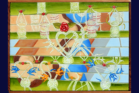 Hullo, it’s me, Lawtell, the artiest cat in town. The vibrant painting that I have here may make you think of Cubism, or a jigsaw puzzle. Or you might think you accidentally ingested some LSD. But no, this painting is realistic! Glass reflected in mirrors. The small blown glass hearts and wishing wells sat on little mirrored steps in a display. You can see the partial reflections of someone looking at them. All those little bluebirds would make me happy if I could only catch them!