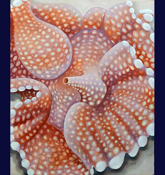 Root-a-toot-toot. This giant clam looks to me like it has a horn. Do you see it in the center of the painting? Giant clams come in fabulous colors. The dots on this one make me think of a wild group of musical notes bebopping all over the place: a delirious composition of swoops and swerves, twists and turns, spots and dots, ruffles and flourishes. When you look closer, you see the color story: each dot a bull’s eye of color upon candy color. And the “empty” places between the rows of dots? They are likewise layered, a triumph of pattern and texture. Just like jazz!