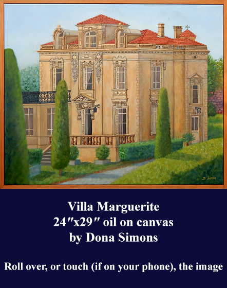 My human stayed in this luscious villa when she was in France painting the Château de La Napoule. The villa’s just across the street from the castle and down the beach road from Cannes. Cannes of what I wonder? I could use a can of something tasty round about now. She did this painting while looking out from a bedroom window in the castle. It’s painted on smooth linen canvas with French Sennelier oil paints that she discovered on that trip. Now she uses them every day.
