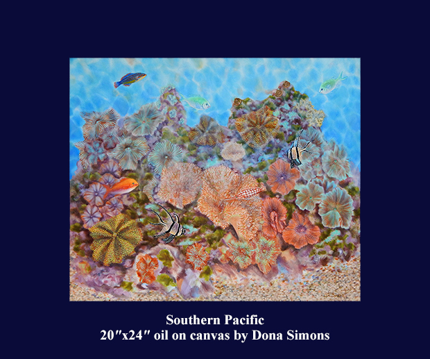 This oil on canvas of soft corals wasn’t painted there, but at the Aquarium of the Americas in New Orleans. She watched the little fishies swim for hours on end, while thousands of people came around. I’m so glad not to have to join that crowd, since I can enjoy the painting without leaving my lair. And you can too, if you write to me and ask about purchasing it. I have plenty of other works of art to entertain me, as you shall see! Send me to your friends and I will positively purr if you post a link to my introduction (donasimons.com/lawtellintro.html) on all your social media.